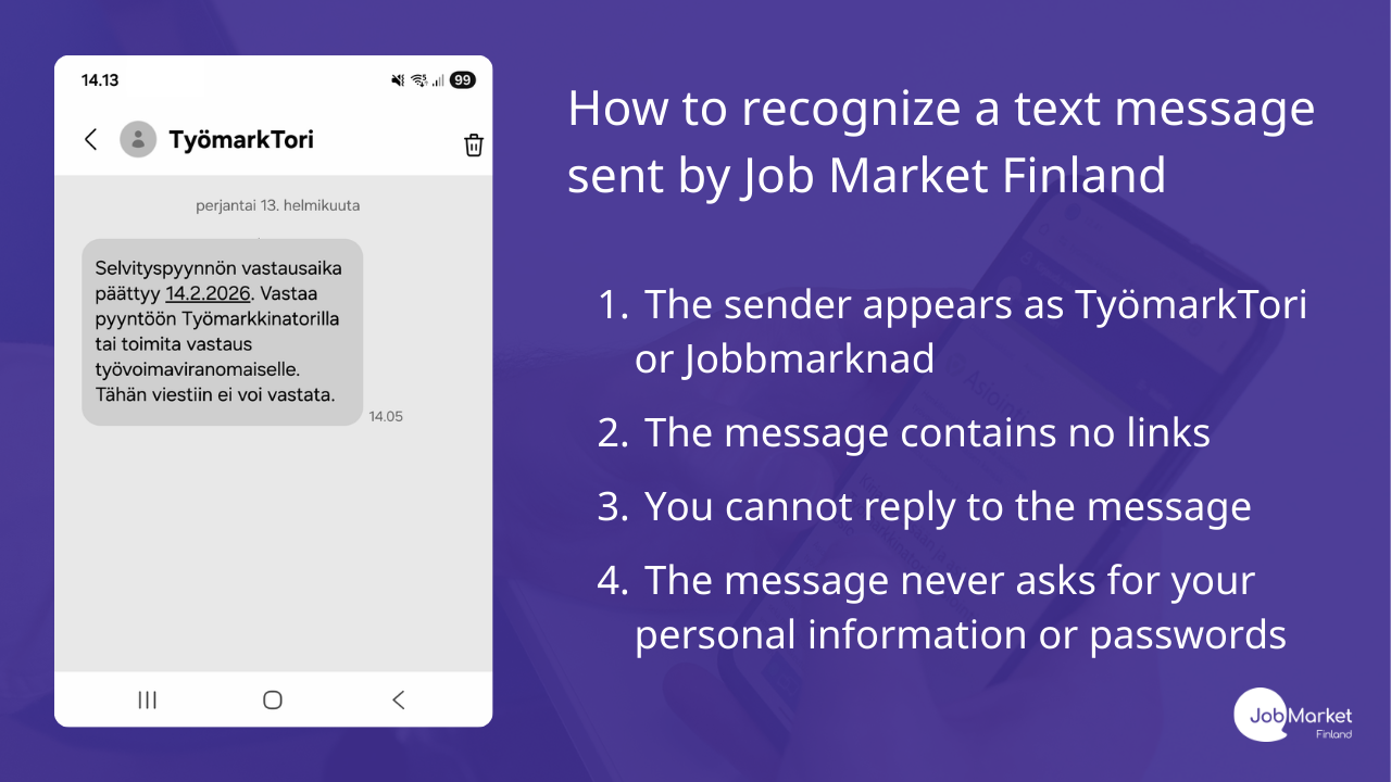In addition to text message reminders, you can receive Suomi.fi reminders about unemployment security if you have activated Suomi.fi Messages. You can also receive messages from appointment reservation systems if the service in question is used in your employment area. The employment official can also send you text messages from other phone numbers. The information described on this page only applies to automatic text message reminders.