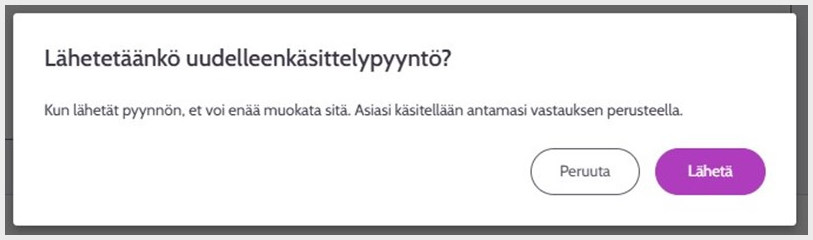 When you select the arrow on the right-hand side of the 'Uudelleenkäsittelyn pyytämienn / Request reprocessing' box, instructions for requesting reprocessing open and you will find the 'Pyydä uudelleenkäsittelyä / Request reprocessing' button under it.