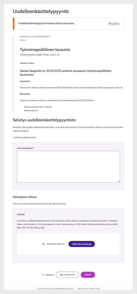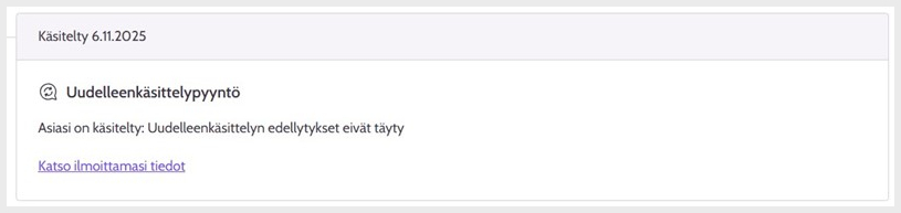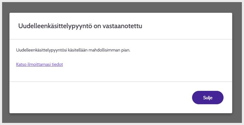 Your reprocessing request will be forwarded to the designated specialist or the KEHA Centre in the area of responsibility for unemployment security.