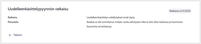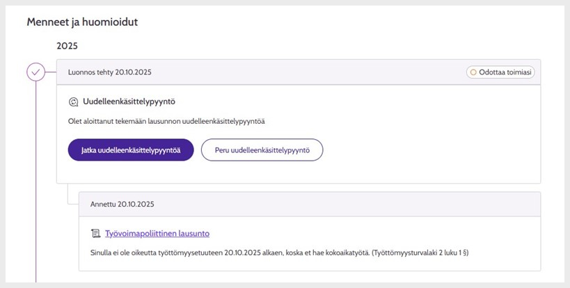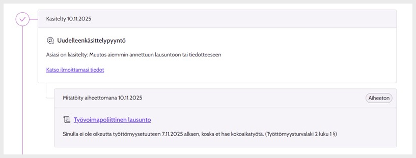 Once your reprocessing request has been processed, you will see the reprocessing decision under the 'Tehtävät ja tapahtumat / Tasks and events' tab in the Online Service section of Job Market Finland.