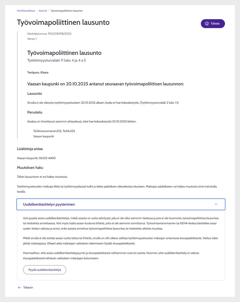 If you do not have the opportunity to submit a request for reprocessing in Job Market Finland Online Service, you can contact the employment services office in your area and request reprocessing.