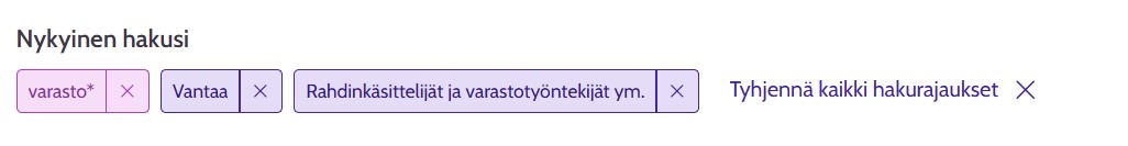 Sanahaun lisäksi voit rajata tuloksia erilaisilla suodattimilla. Suodattimia käyttäessä on hyvä huomioida, että osa ilmoittajista ei täytä työpaikkailmoituksiinsa kaikkia mahdollisia tietoja tai osa tiedoista löytyy ilmoituksen kuvaustekstistä. Tämän vuoksi esimerkiksi työskentelyajan tai työn jatkuvuuden tietoihin perustuvat suodattimet saattavat rajata pois ilmoituksia, joissa kyseistä tietoa ei ole määritelty. Jos haluat mahdollisimman kattavan näkymän työpaikoista, kannattaa aika ajoin tarkistaa hakutulokset myös ilman tiettyjä suodattimia tai kokeilla hakua sekä suodattimilla että ilman niitä.