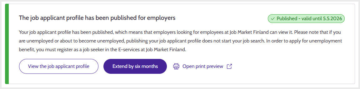 When you publish a job applicant profile, you can present your skills and competence to employers who are looking for employees at Job Market Finland. Employers can browse published job applicant profiles in the employee search, and when an employer publishes a job posting, Job Market Finland provides proposals on suitable job seekers. If you want to allow employers using Job Market Finland to see your profile and contact you, click on ‘Review and publish’. The employers' contact requests are sent by email, so please remember to check whether you have received messages. When you publish a profile, you also need to set a publication period for it. This can be for up to six months. Remember to republish your profile if necessary.