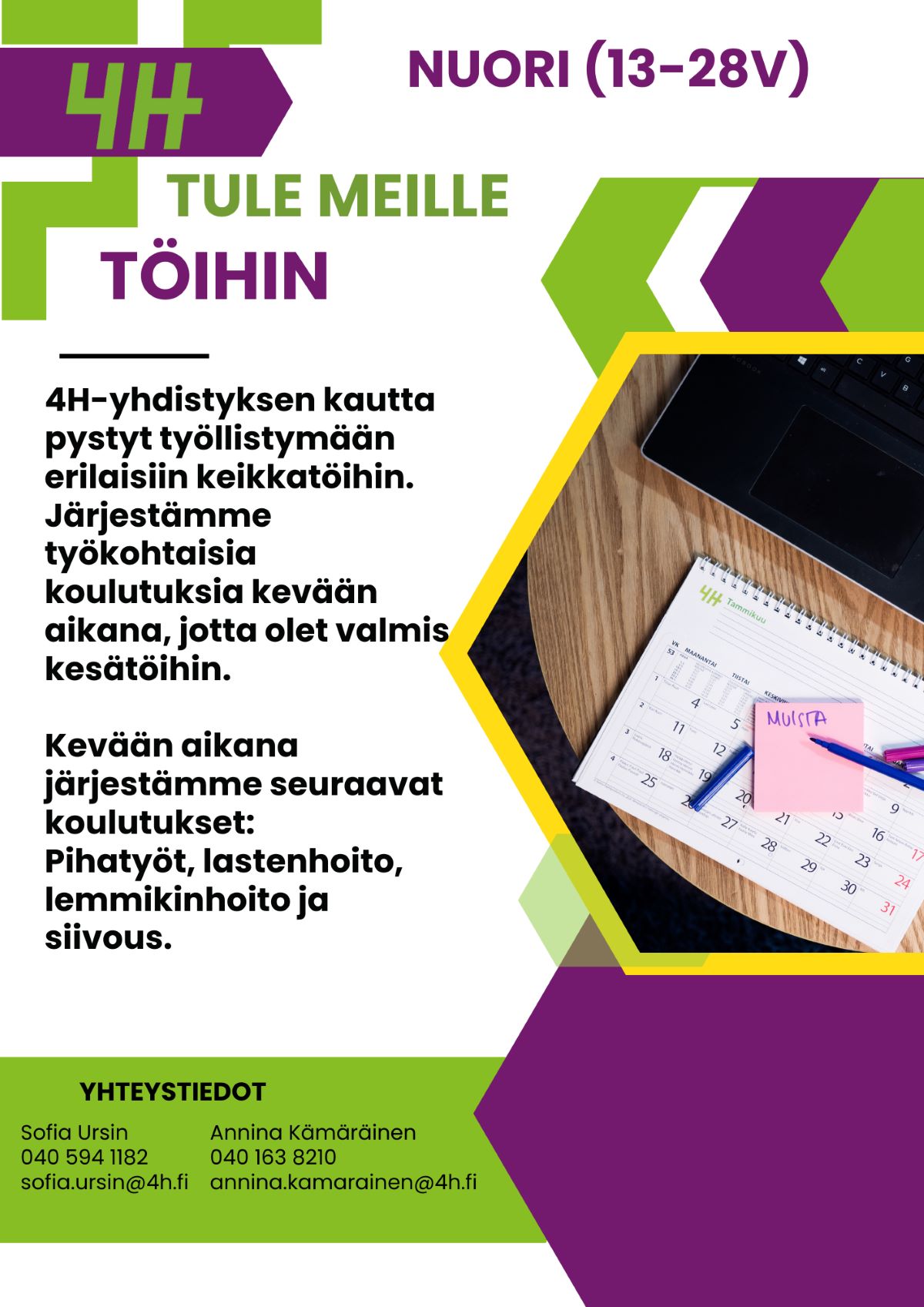 Haaveiletko ammatista lastenhoitoalalla ja pidät lasten kanssa touhuamisesta tai pidätkö siitä, että näet työssä oman kädenjälkesi? 4H-yhdistys ja Kylä nuoret töihin-hanke järjestää toukokuussa 13–28 vuotiaille nuorille suunnattuja koulutuksia.