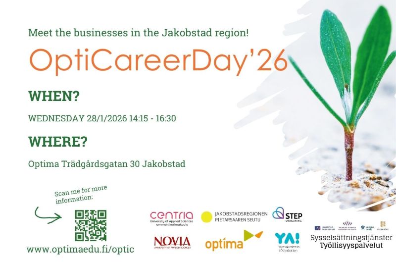 The event, held on Wednesday 28 January 2026, offers many opportunities for encounters between working life and the employees of tomorrow. The organizing team already includes Optima, Concordia, Centria, Novia, Yrkesakademin, and Step Education. This year, Employment Services also joins the planning team, further strengthening the connection between education, employment services, and the business sector.