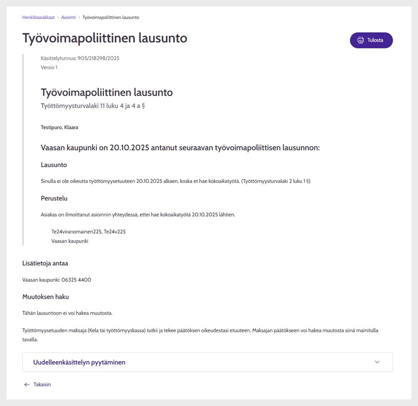 Kuva 1: Työvoimapoliittinen lausunto ja uudelleenkäsittelyn pyytäminen. Huomioithan, että kuvassa näkyvät tiedot ovat testiasiakkaan tietoja.
