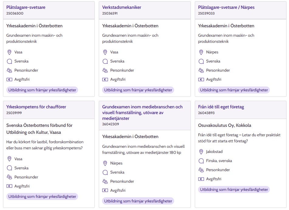 När du söker utbildningar och träningar kan du begränsa sökresultaten till exempel efter landskap eller kommun.