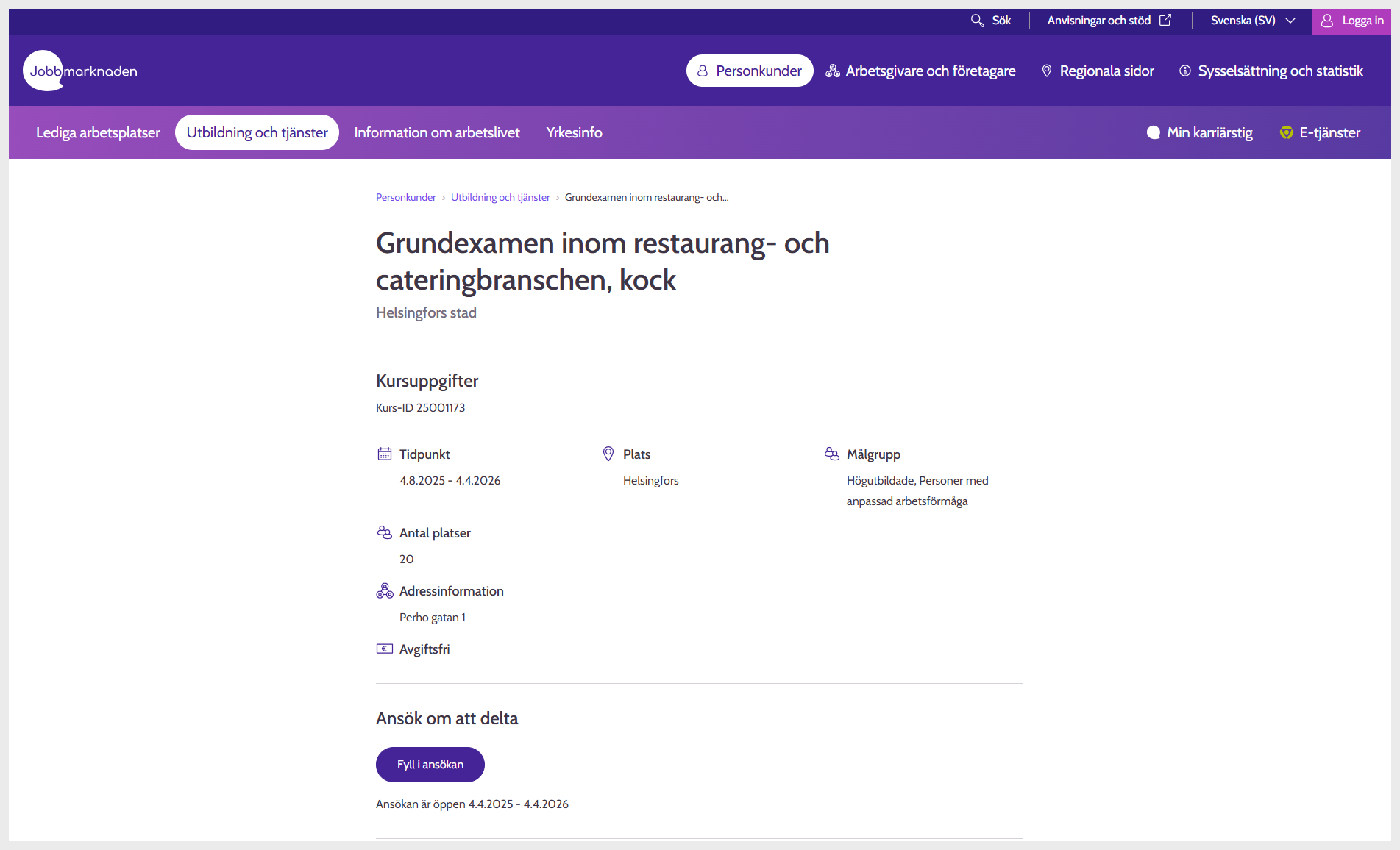 Välj den arbetskraftsutbildning som intresserar dig och bekanta dig med uppgifterna i den. När du vill söka till utbildningen väljer du Fyll i ansökan. Du kan söka till arbetskraftsutbildningar på Jobbmarknaden endast om du är starkt identifierad.