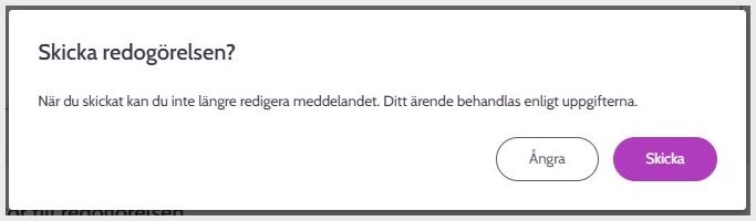 När du har lämnat din redogörelse för begäran om omprövning och bifogat eventuella bilagor kan du skicka din begäran om omprövning för handläggning genom att välja knappen Skicka.