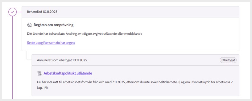 När din begäran om omprövning har behandlats ser du avgörandet av omprövningen på Jobbmarknadens ärendehanteringssida på fliken Uppgifter och händelser.