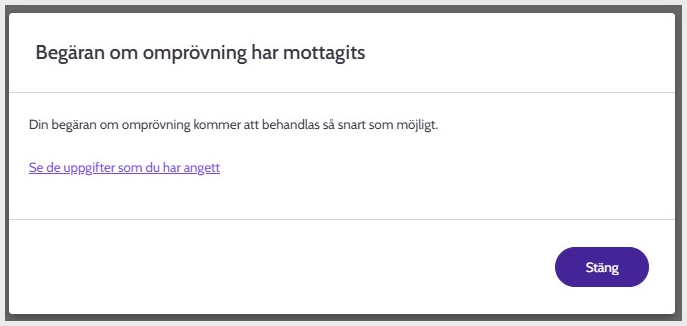 När du har skickat in din begäran om omprövning får du en mottagningsbekräftelse.