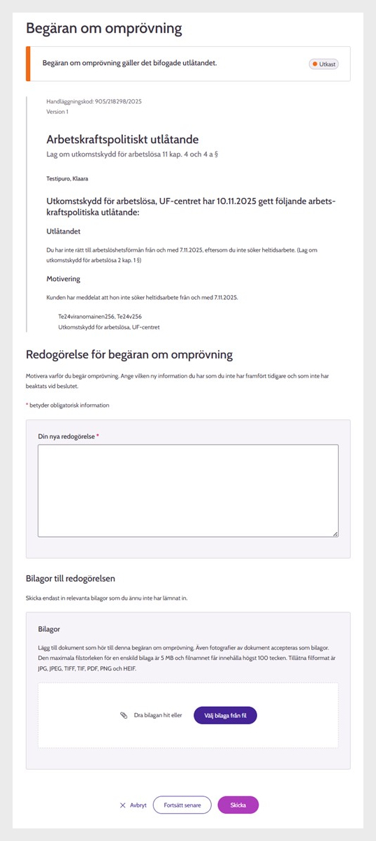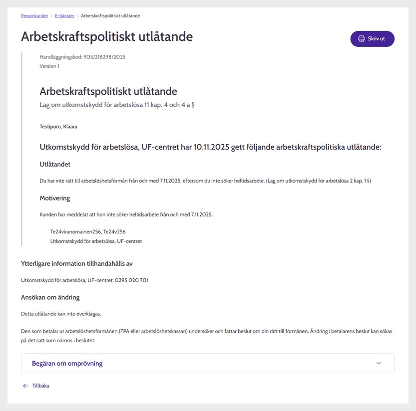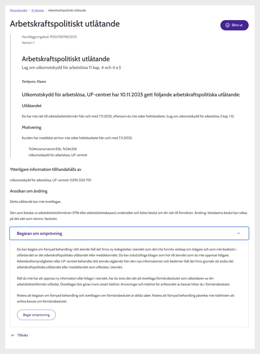 Bild 1: Arbetskraftspolitiskt utlåtande och begäran om omprövning. OBSERVERA! Informationen på bilden är testkundens.