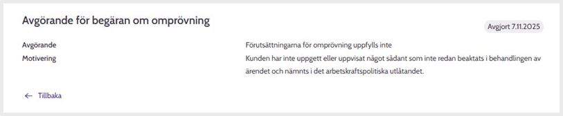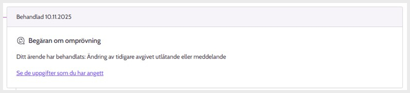 Bild 9: En behandlad begäran om omprövning, som visar avgörandet av omprövningen. Under avgörandet finns en länk Se de uppgifter som du har angett, som för till uppgifterna av begäran om omprövning och motiveringen av avgörandet.