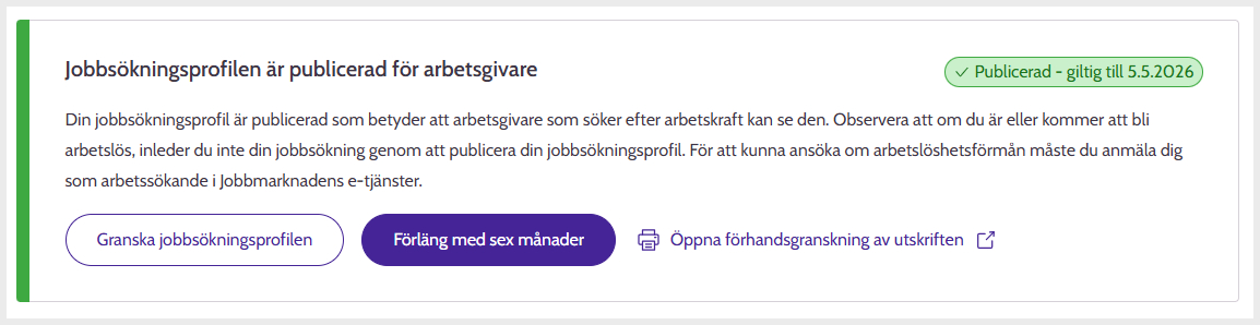 Om din jobbsökningsprofil är publicerad och du fått ett meddelande att den snart föråldras, kan du publicera den igen via att klicka på knappen "Förläng med sex månader".