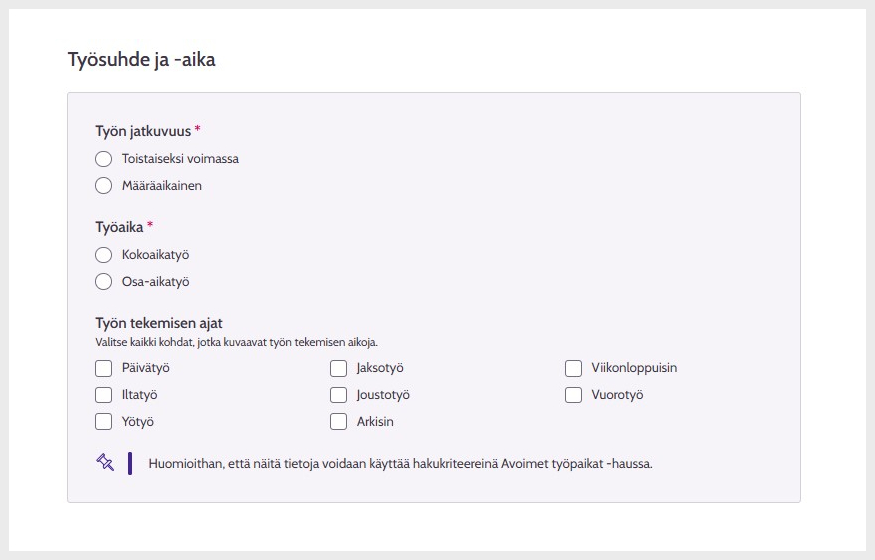 Tarkemmat tiedot -välilehdellä voit kuvata työtehtävään liittyviä muita tietoja. Tietoja hyödynnetään esimerkiksi työpaikkahaun ja selausten suodattimissa, joten ne kannattaa valita kuvaamaan työpaikkaa mahdollisimman tarkasti.