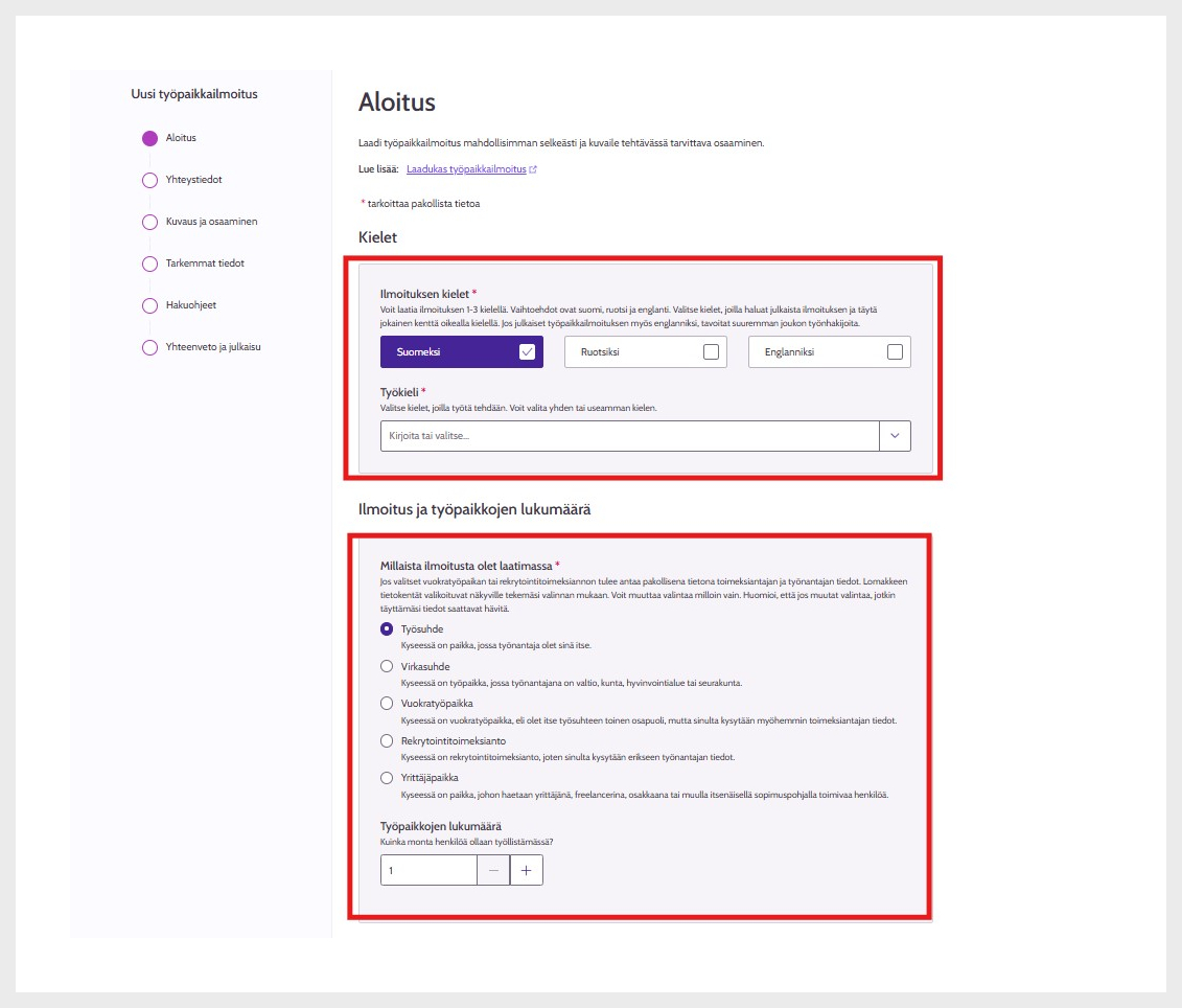 Aloitus-välilehdellä valitaan työpaikkailmoituksen kieli, työkieli, työpaikkojen lukumäärä ja millaista ilmoitusta olet tekemässä (työsuhde, virkasuhde, vuokratyöpaikka, rekrytointitoimeksianto ja yrittäjäpaikka).