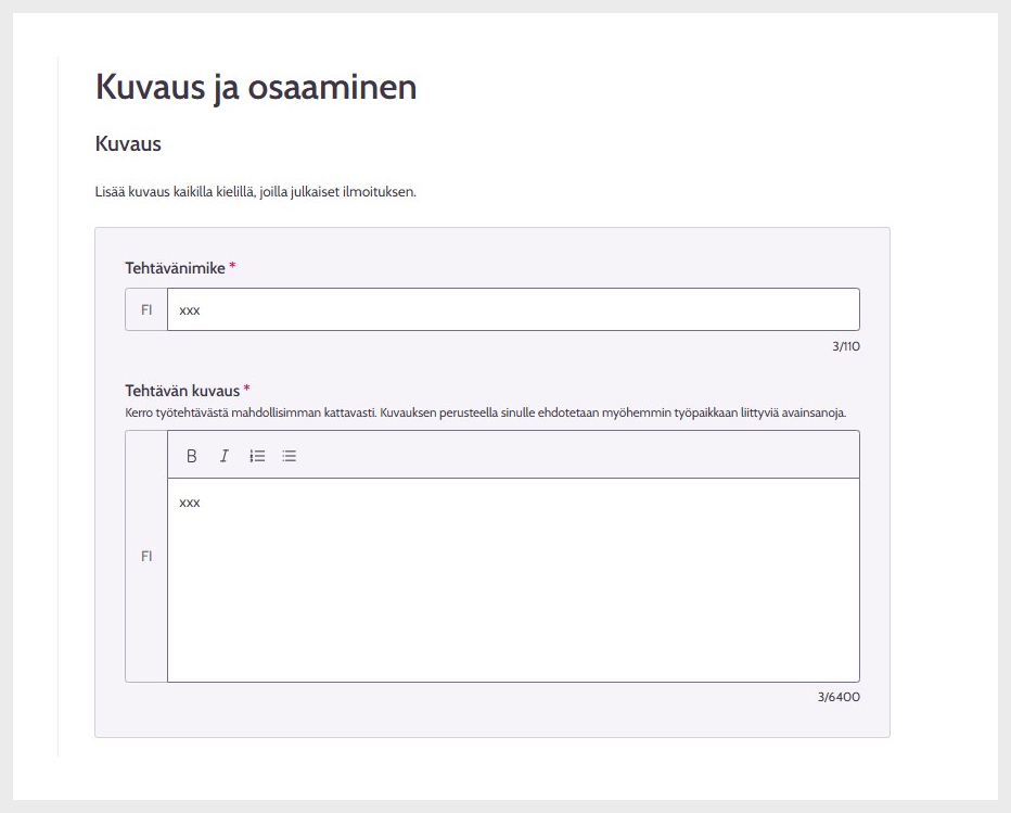 Kuvaus ja osaaminen -välilehdellä kirjoitat työpaikkasi kuvauksen, valitset avainsanat ja pääasiallisen ammatin, jota käytetään tilastoinnissa. Kuvaile huolellisesti, millaisesta työtehtävästä on kyse.