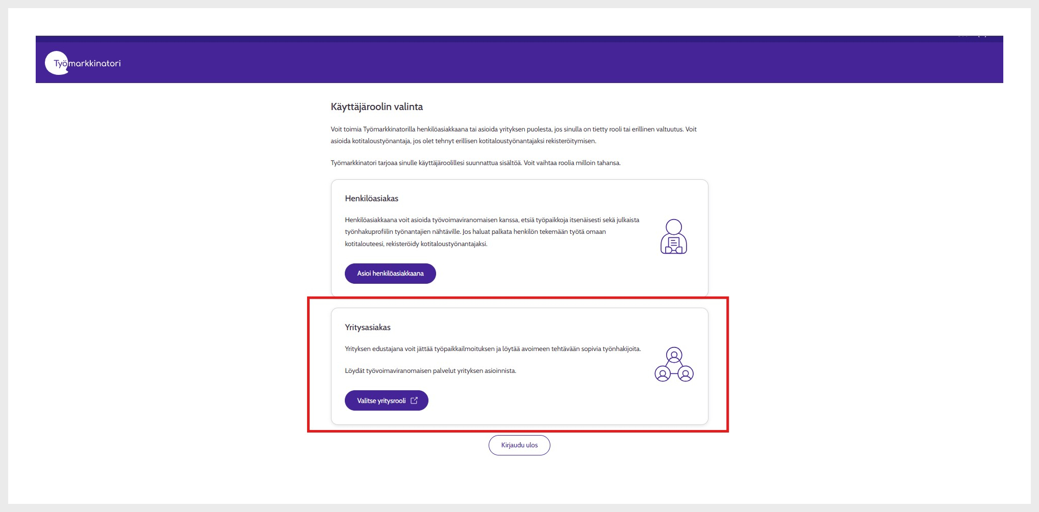 Kun haluat luoda työpaikkailmoituksen, tulee sinun valita asioinnissa yritysrooli. Jos haluamasi yritys ei näy roolien valintalistalla, tarkista, onko sinulla tarvittavat valtuudet edustaa yritystä. Lisää tietoa valtuuksista löydät sivulta Kirjautuminen Työmarkkinatorille ja valtuudet.