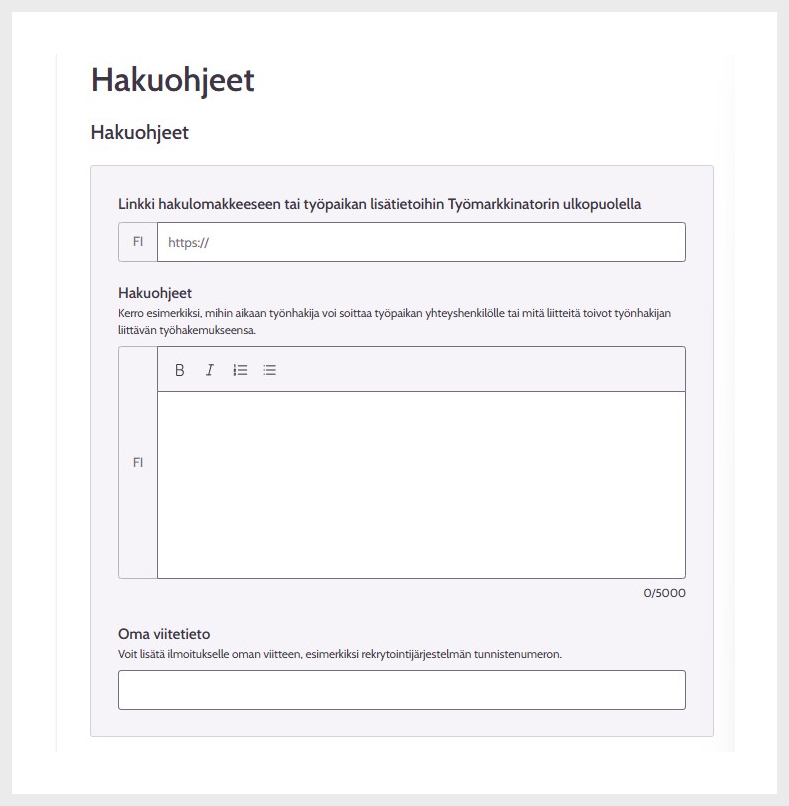 Om du gör en annons på engelska och väljer engelska som arbetsspråk överförs platsannonsen automatiskt till webbplatsen Work in Finland. På så sätt får du bästa möjliga synlighet för din annons på offentliga plattformar för internationell rekrytering som används av arbetssökande som är intresserade av Finland.