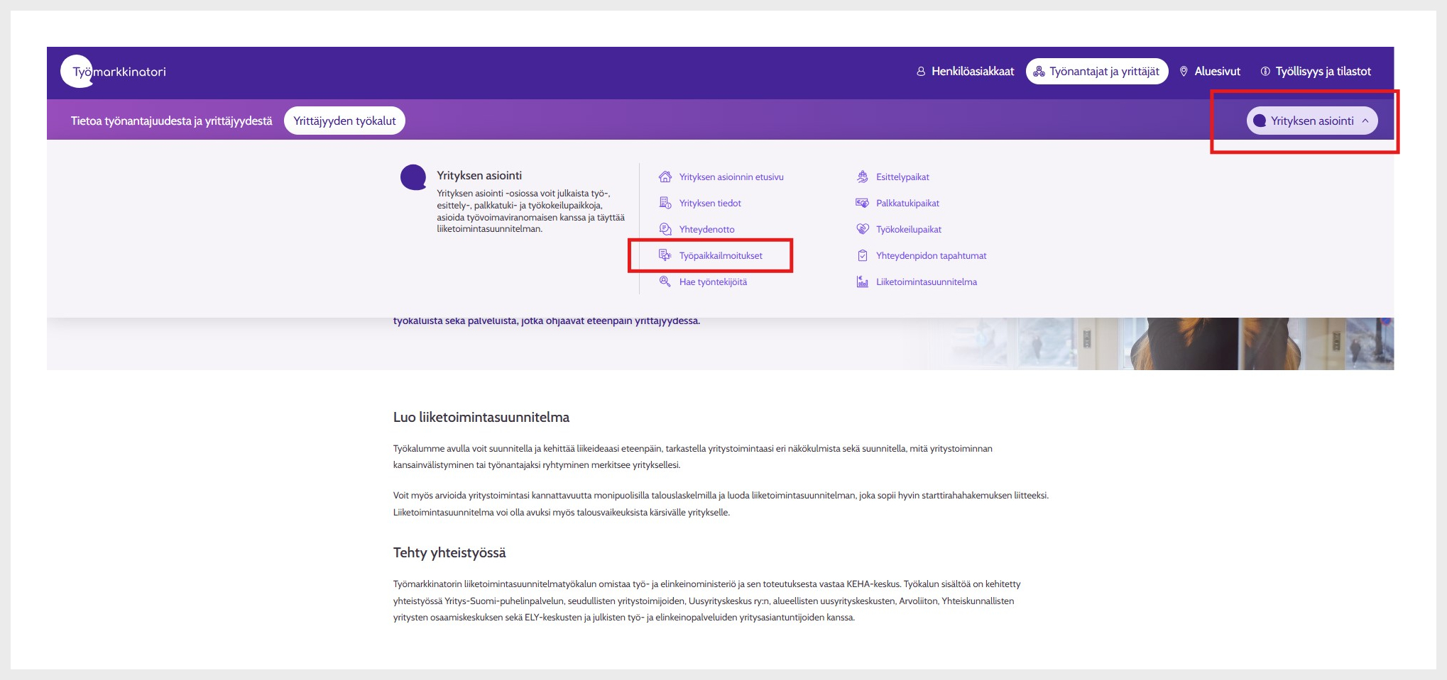 3. Navigoi työpaikkailmoituksen tekoon Yrityksen asioinnin kautta