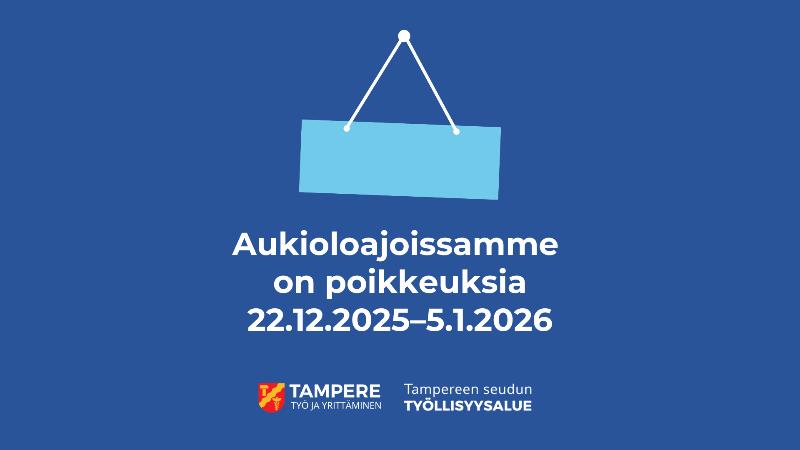 Joulun aika ja vuodenvaihde tuovat poikkeuksia aukioloaikoihin Tampereen kaupungin työllisyys- ja kasvupalveluissa. Poikkeavia aukioloaikoja on aikavälillä 22.12.2025–6.1.2026.