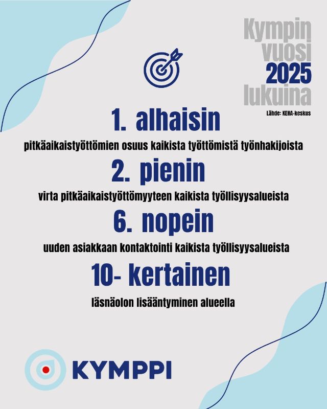 Kuntayhtymä Kympin ja samalla Kympin työllisyysalueen ensimmäinen varsinainen toimintavuosi 2025 on saatu tilinpäätöksen ja toimintakertomuksen osalta valmiiksi. Kuntayhtymä Kymppi toimii työvoimaviranomaisena Alajärven, Alavuden, Evijärven, Kauhavan, Kuortaneen, Lapuan, Lappajärven, Soinin, Vimpelin ja Ähtärin muodostamalla Kympin työllisyysalueella.
