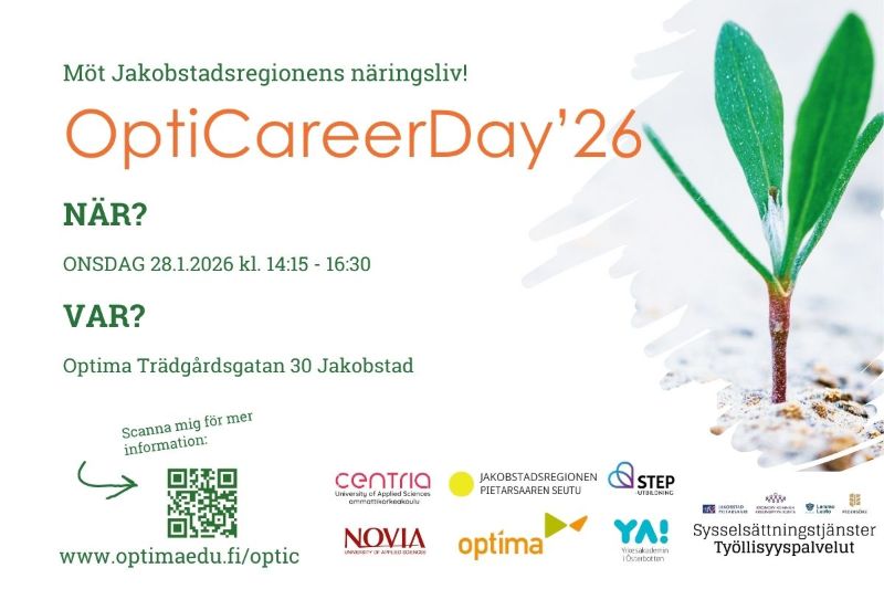 Möt Jakobstadsregionens näringsliv. Onsdagen den 28 januari ordnas OptiCareerDay’26 i samarbete mellan utbildningsanordnare och Jakobstadsregionens näringsliv. Evenemanget riktar sig till alla som söker arbete eller utbildning och till personer som överväger nya karriärmöjligheter. Kunnig arbetskraft behövs!