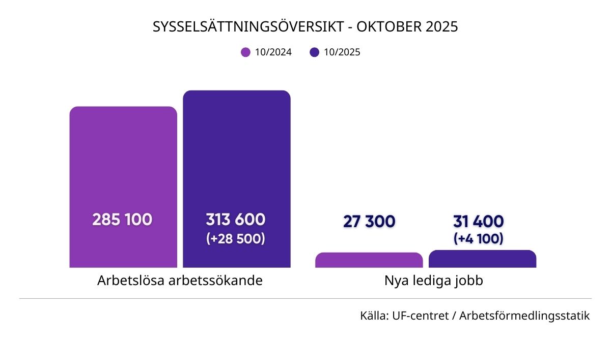 Antalet arbetslösa arbetssökande ökade med 28 500 personer jämfört med oktober förra året. Totalt fanns det 54 800 lediga jobb i oktober, 3 400 fler än för ett år sedan.