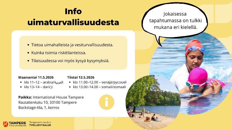 International House Tampereen kotoutumispalvelut järjestää yhdessä Tampereen kaupungin liikuntapalveluiden kanssa 4 erillistä tietoiskua uimaturvallisuudesta.