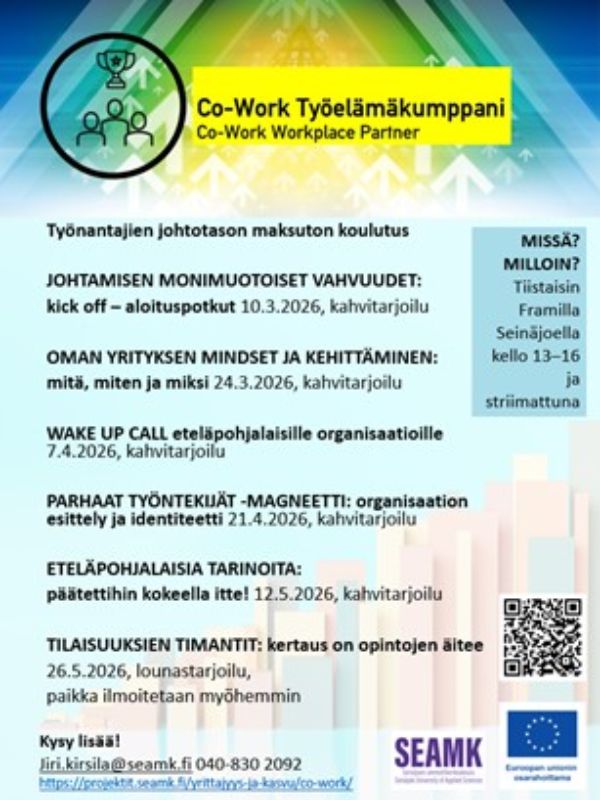Co-Work Työelämäkumppani -hankkeessa lisätään yritysten osaamista kansainvälisen ja monikulttuurisen työyhteisön kehittämiseen. Hanke aloittaa johtotason ja HR-ammattilaisten koulutuksella keväällä 2026. Koulutus on hyvin käytännönläheinen ja yritysten tarpeisiin suunnattu. Osallistujat saavat koulutuskokonaisuuden suorittamisesta Edelläkävijä-osaamismerkin. Koulutus on maksuton ja alkaa 10.3.2026. Osallistumalla vähintään viiteen osuuteen organisaatiosi saa Edelläkävijyys-osaamismerkin.