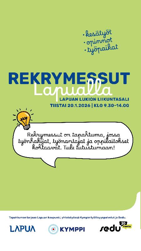 Tiistaina 20. tammikuuta työnantajayritykset valtaavat Lapuan lukion liikuntasalin esitelläkseen toimintaansa ja ennen kaikkea avoimia työmahdollisuuksia. Jos kesätyöpaikka on siis etsinnässä, niin nyt on oikea hetki suunnata katsastamaan tarjonta. Esillä on myös muita avoimia työpaikkoja, kausitöitä ja myös pidempiaikaisia.