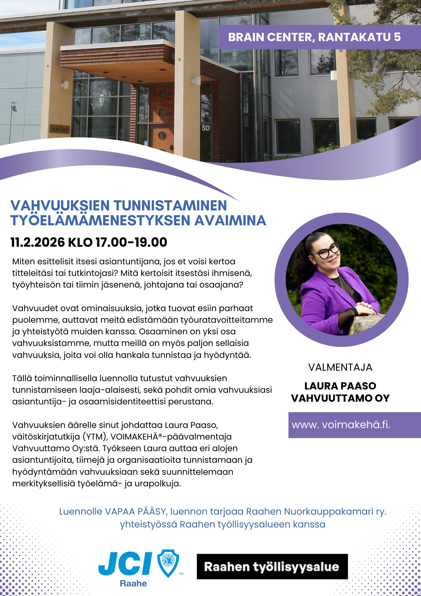 Luennolle on vapaa pääsy ja sen tarjoaa Raahen Nuorkauppakamari ry yhteistyössä Raahen työllisyysalueen kanssa.