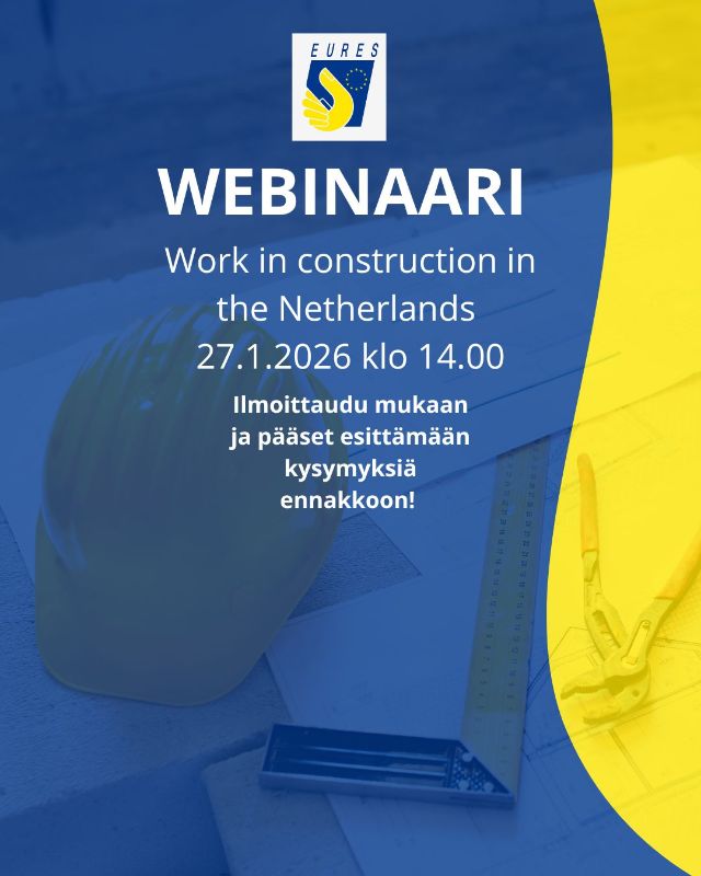 Tule mukaan rakennusalan webinaariin kuulemaan työntekomahdollisuuksista Alankomaissa! Alankomaiden EURES sekä kaksi hollantilaista työnantajaa esittelevät, millaista on työskennellä rakennusalalla Alankomaissa ja millaisia avoimia työpaikkoja heillä on tarjolla eri tehtävissä. Sopivia osaajia etsitään Suomesta webinaarin kautta.