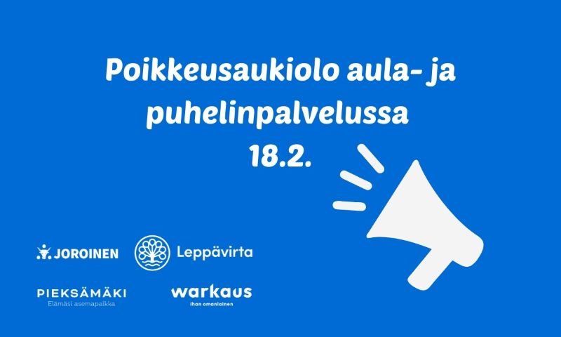 Toimipisteemme Varkaudessa, Pieksämäellä ja Joroisissa sekä puhelinpalvelu palvelevat keskiviikkona 18.2. klo 9-11. Henkilöstömme osallistuu kehittämispäivään iltapäivän ajan, jolloin olemme suljettuna.
