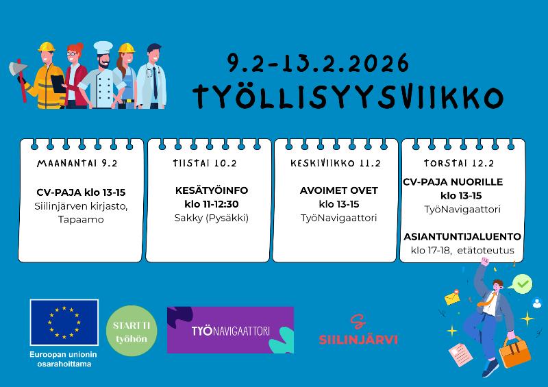 Siilinjärven työllisyyspalveluissa vietetään työllisyysviikkoa 9.2.2026–13.2.2026 ja viikon aikana tarjolla on monipuolisia tapahtumia työnhakijoille, nuorille ja työikäisille. Viikon ohjelmaan sisältyy työnhakutaitojen kehittämistä, työnhaun tukemista sekä TyöNavigaattorin palveluihin tutustumista. Osana työllisyysviikkoa työllisyyspalvelut jalkautuvat oppilaitoksiin vinkkaamaan opiskelijoille kesätyönhausta.